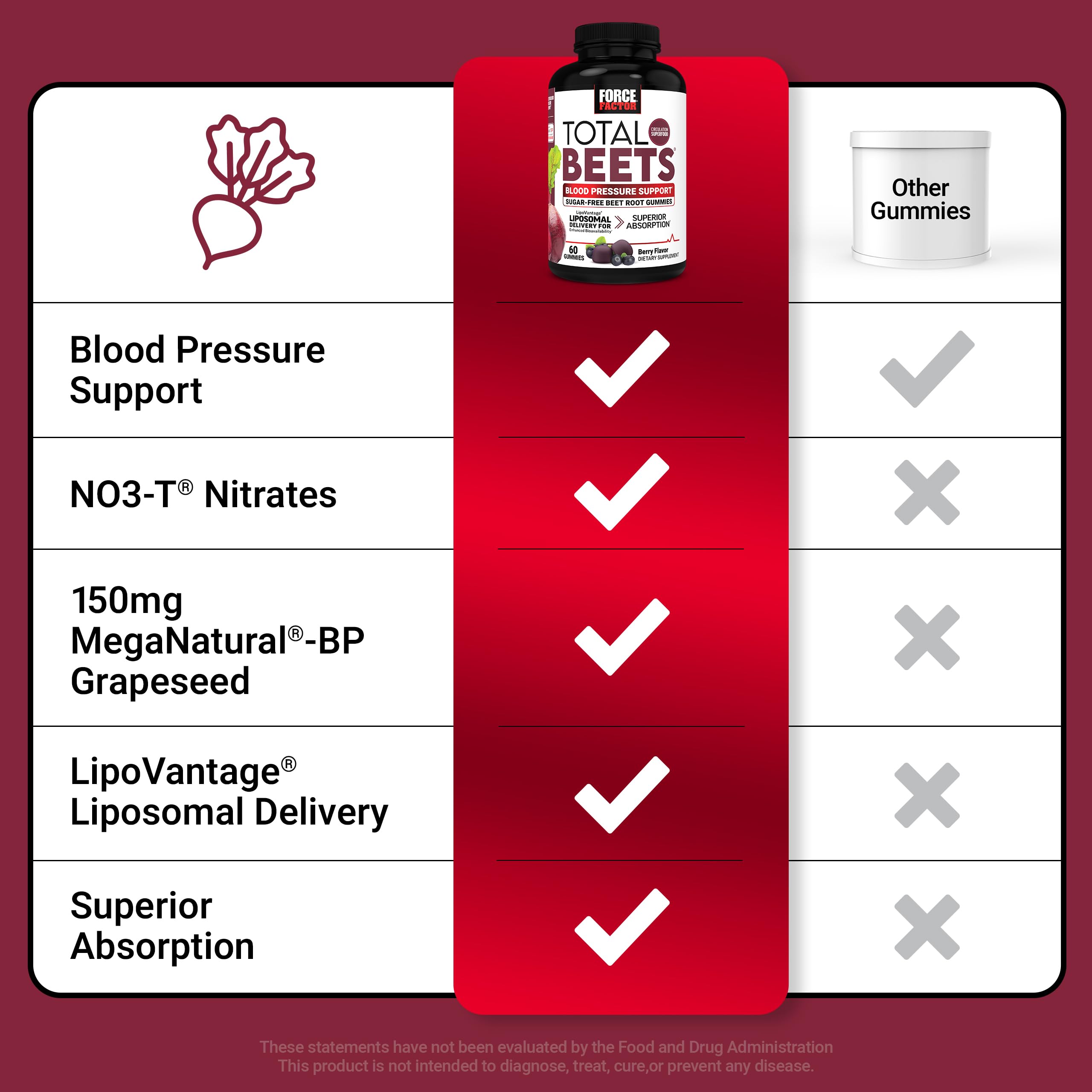 KEEP YOUR HEART HAPPY Poor cardiovascular health affects millions of men and women every day. And with your busy lifestyle, keeping your heart healthy and happy can be a challenge. To make matters worse, too few supplements truly work to provide the cardiovascular support you want. Total Beets Blood Pressure Support soft chews were carefully formulated to change that. This premium and delicious blood pressure support supplement contains MegaNatural-BP, a patented grapeseed extract clinically shown to support blood pressure in the normal healthy range. Thanks to powerful beetroot nitrates, with just two tasty soft chews per day, you can expect an increase in nitric oxide production for improved circulation and nutrient delivery throughout your body, plus a boost of stimulant-free heart-healthy energy. And that’s in addition to the incredible blood pressure support benefits. Take care of your heart and Unleash Your Potential in life with Total Beets Blood Pressure Support soft chews — you’ll be happy you did.