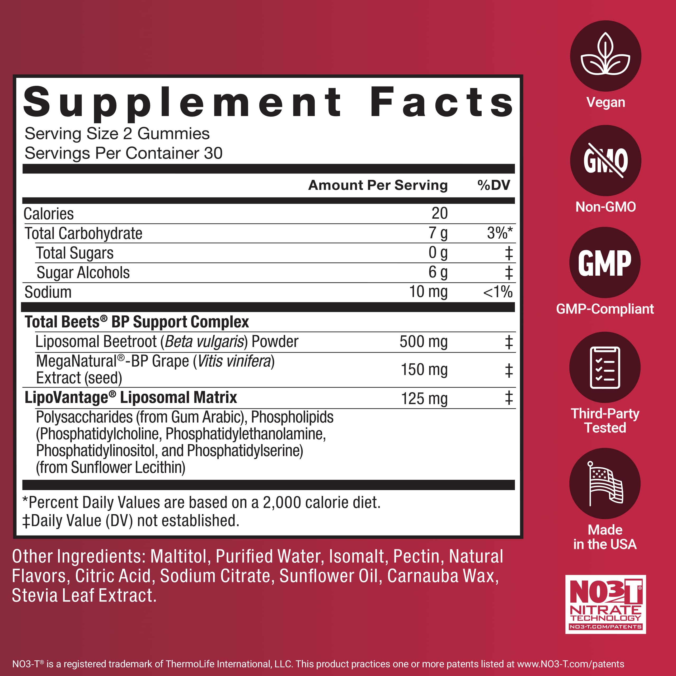 · MADE WITH PREMIUM NO3-T NITRATES: To ensure you’re getting a top-quality beets supplement, every serving of Total Beets Blood Pressure Support chews provide NO3-T nitrates, a premium and patented form of beet powder extract.
