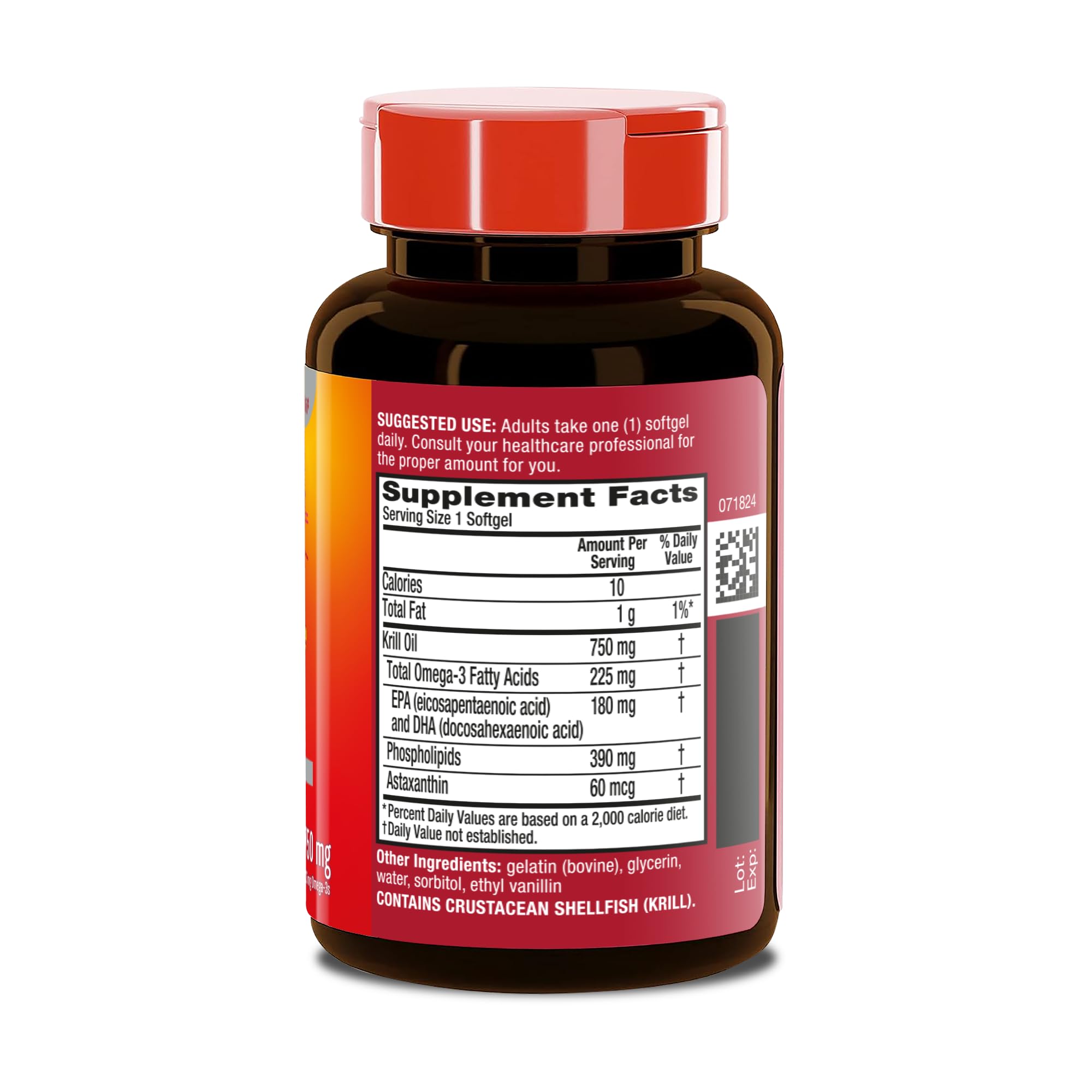 Antarctic krill is rich in the natural antioxidant astaxanthin that gives the krill in these softgels their deep red color.