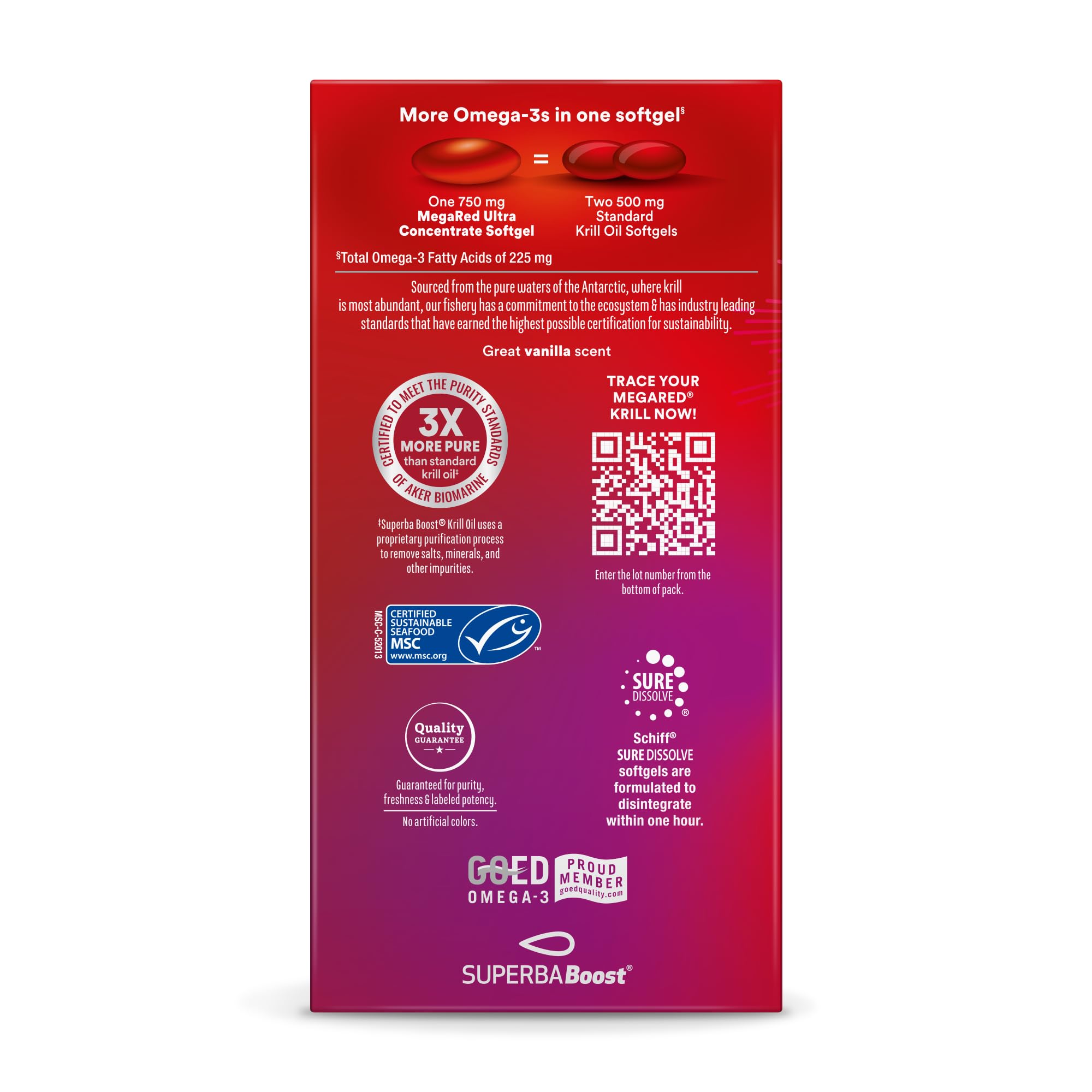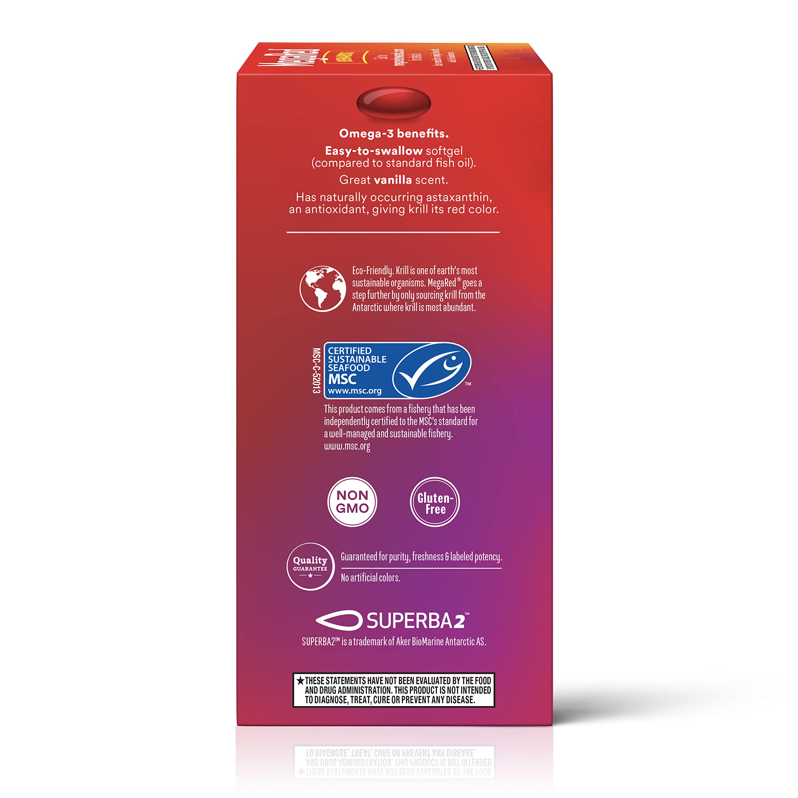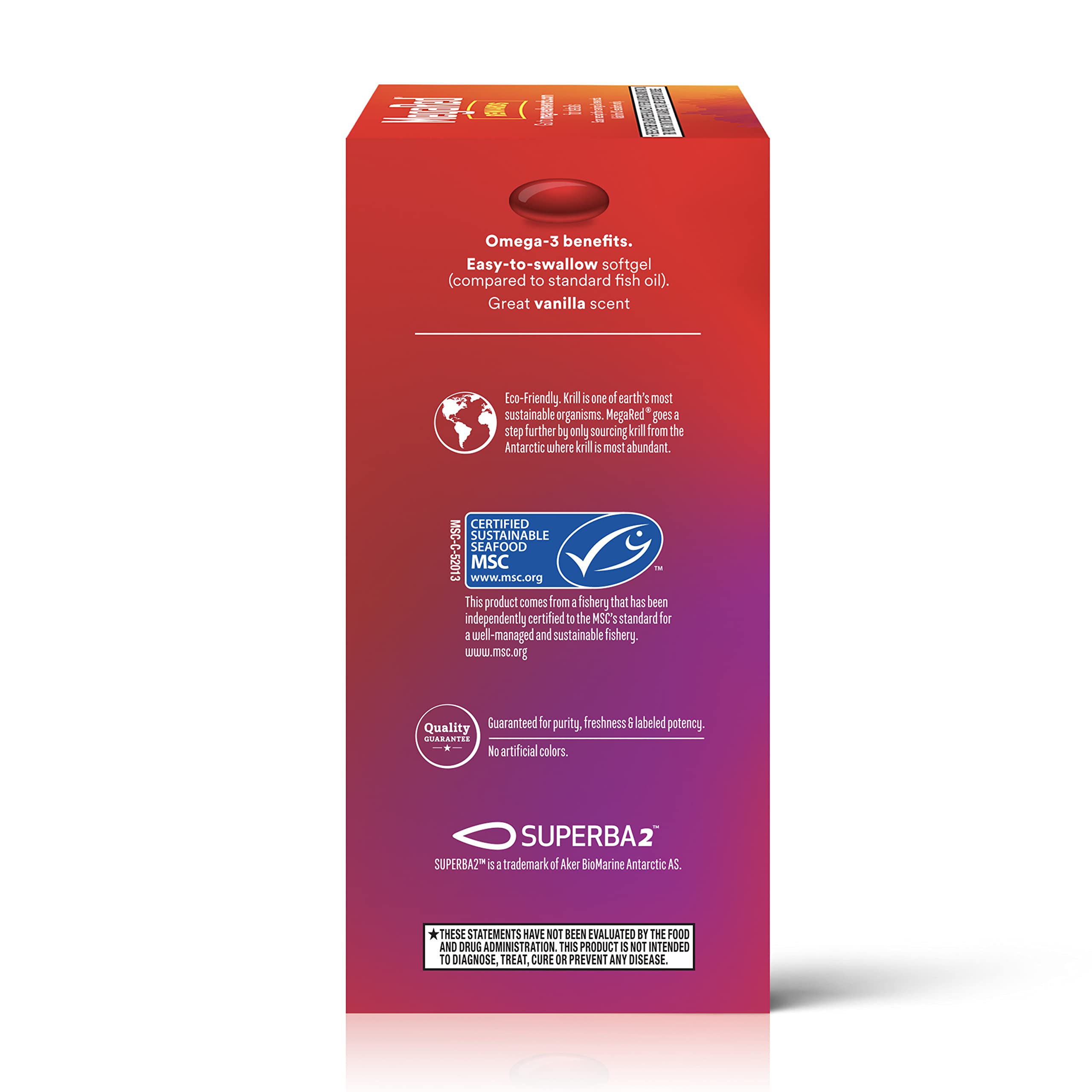 Krill is one of the world’s most abundant and sustainable organisms. MegaRed only sources krill from the Antarctic where krill is most abundant. MegaRed Omega 3 Krill Oil has been shown to significantly increase your omega 3 index in just 30 days.* Supportive research has shown that consumption of EPA and DHA omega-3 fatty acids may reduce the risk of coronary heart disease§. MegaRed Omega 3 Krill Oil supplements provide an optimal combination of omega-3 fatty acids and the powerful antioxidant astaxanthin to support heart health in a once daily softgel.* MegaRed is the #1 Doctor Recommended Krill Oil brand for heart health. Don’t just take our word for it check out our 5-star rating and read our customer reviews. MegaRed with PureTechTM is 3x MORE PURE than regular krill oil. Salts and other impurities are removed to provide the purest krill oil on the market. Krill Oil is carried in a phospholipid form which is better absorbed by the human body and because it’s krill oil as opposed to fish oil, MegaRed Krill Oil has no fishy aftertaste or odor. *These statements have not been evaluated by the Food and Drug Administration. This product is not intended to diagnose, treat, cure or prevent any disease. §Supportive, but not conclusive research shows that consumption of EPA & DHA Omega-3 fatty acids may reduce the risk of coronary heart disease.