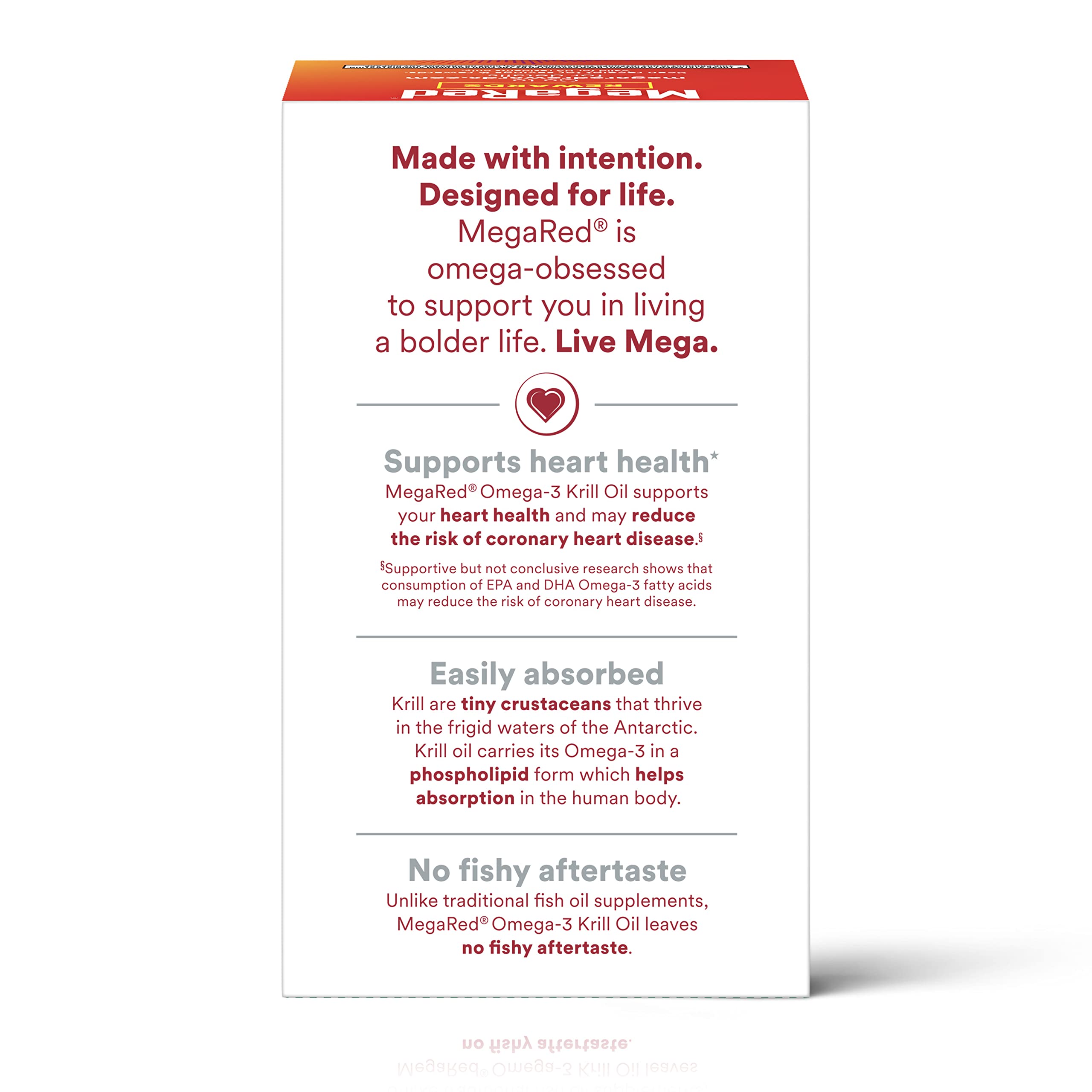 · NO FISHY AFTERTASTE and EASY ABSORPTION: Krill Oil is carried in a phospholipid form which is better absorbed by the human body and because it’s krill oil as opposed to fish oil, MegaRed Krill Oil has no fishy aftertaste or odor.