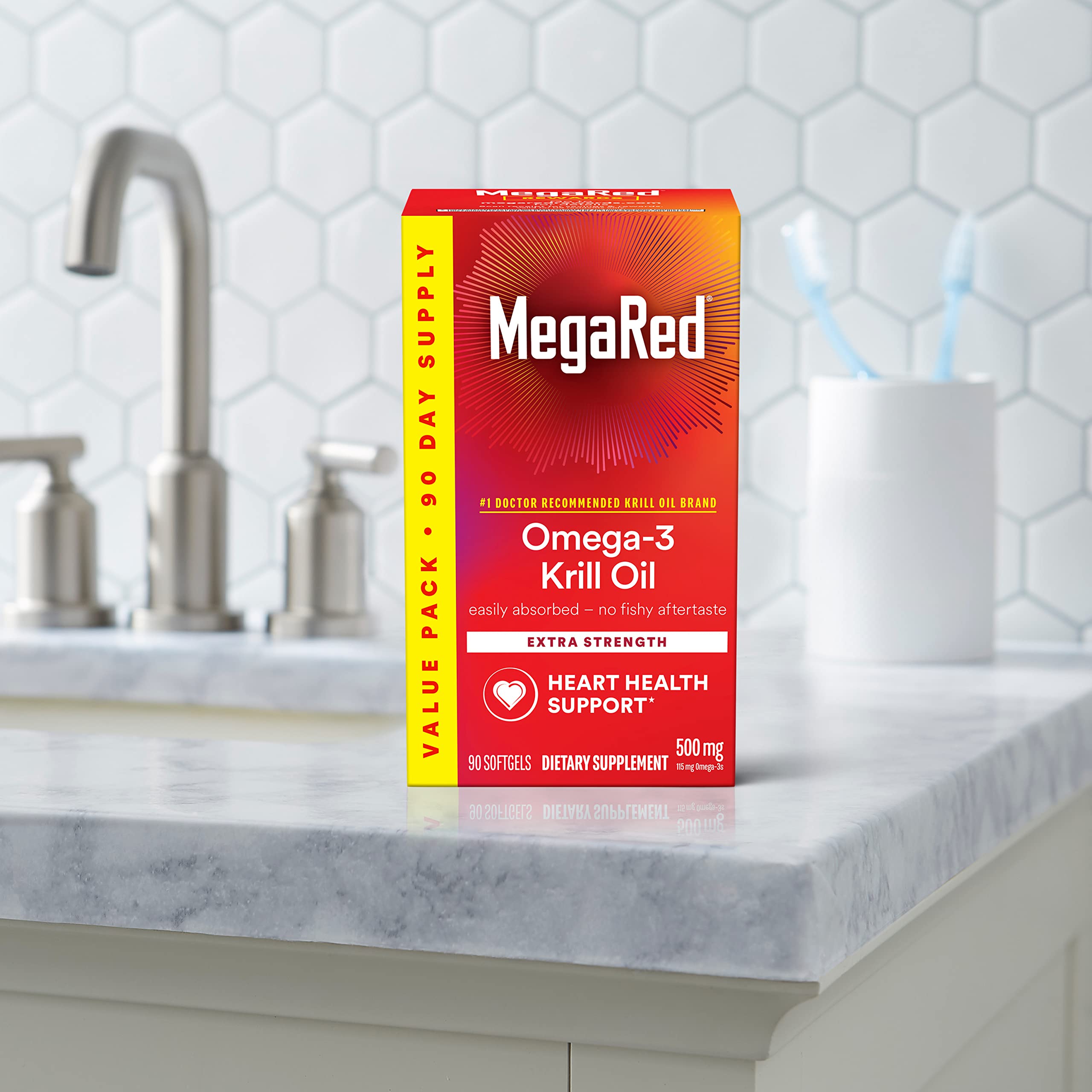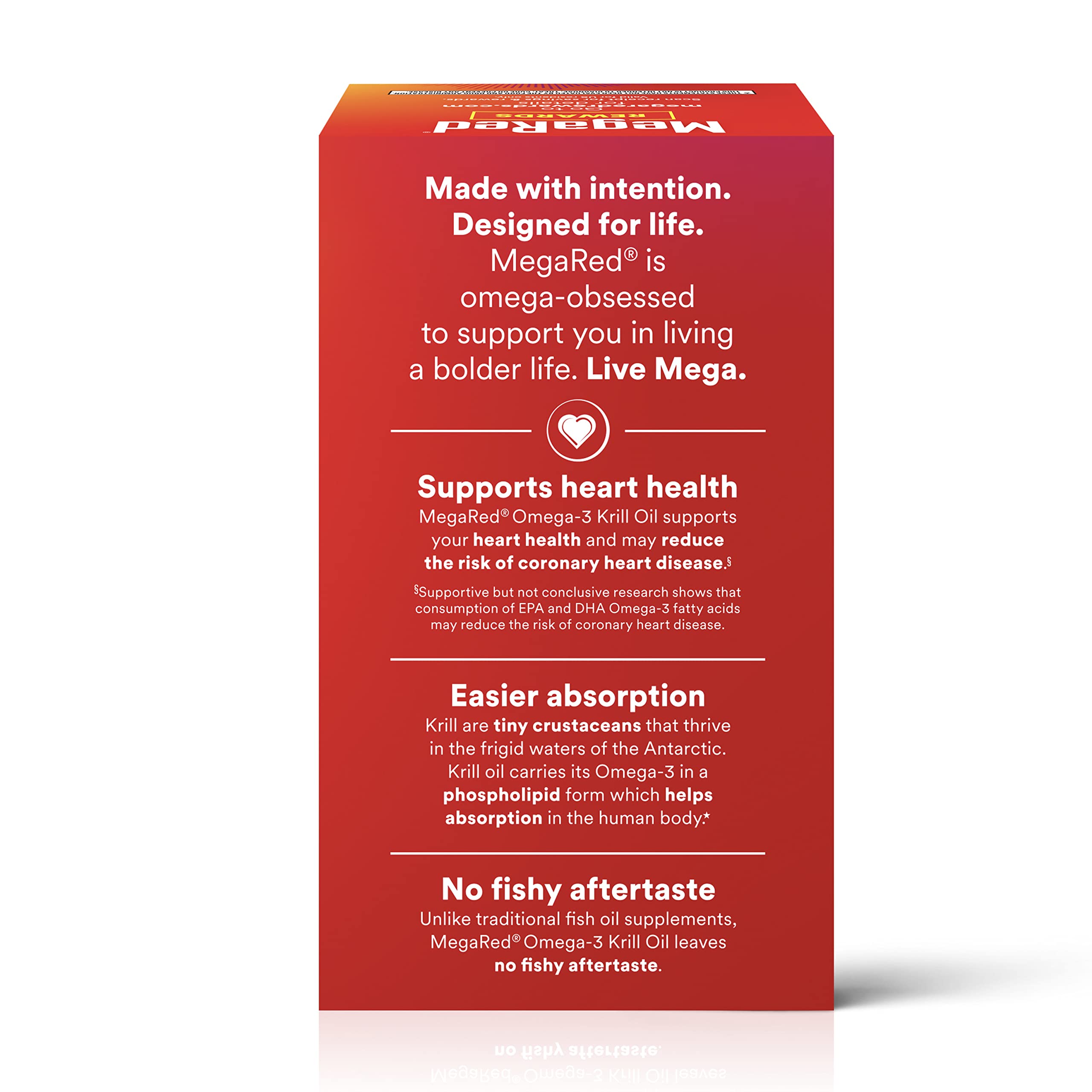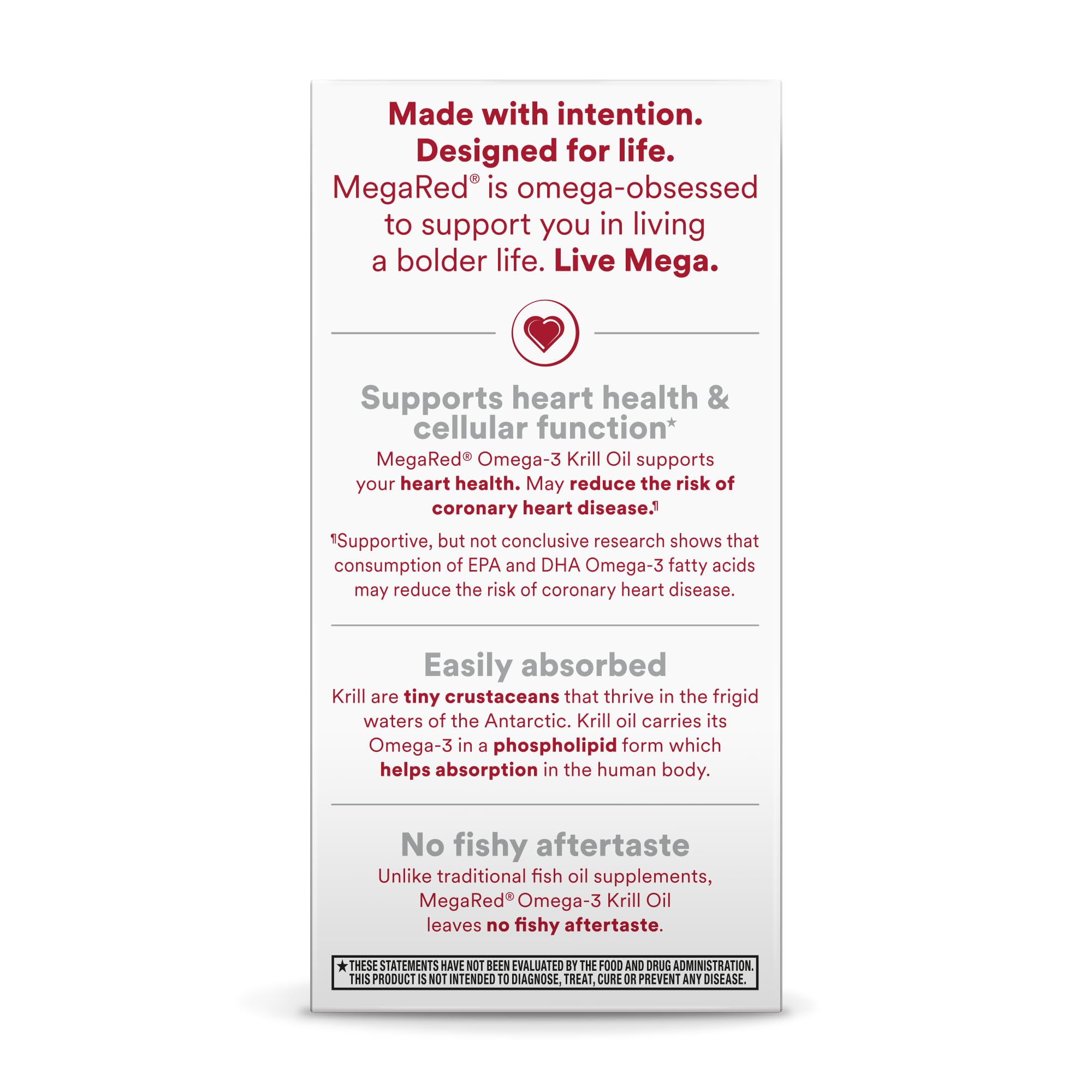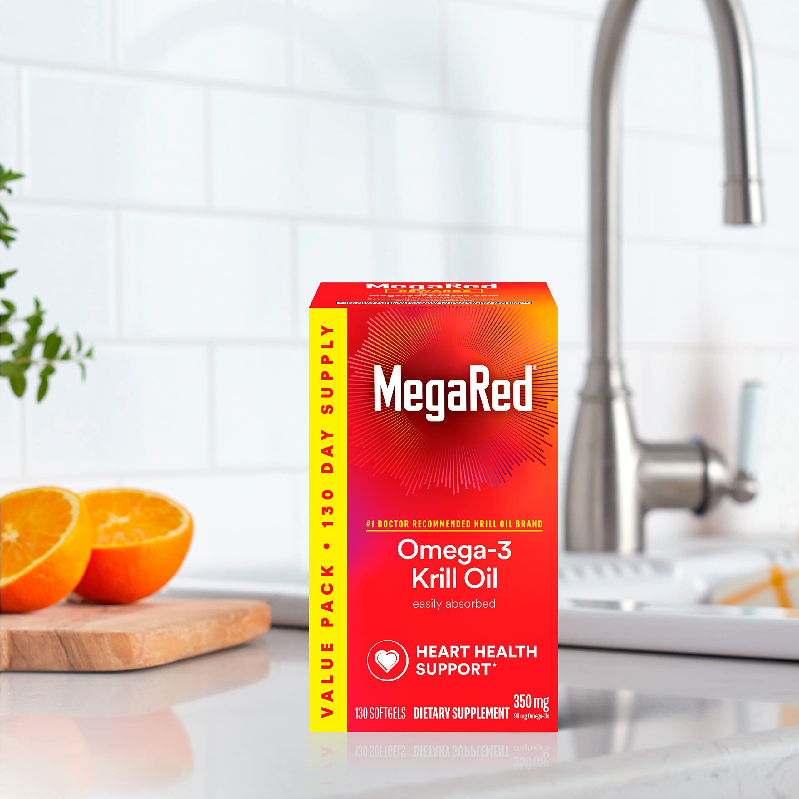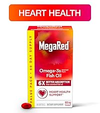 · HEART HEALTH: MegaRed Omega 3 Krill Oil supplements provide an optimal combination of omega-3 fatty acids and the powerful antioxidant astaxanthin to support heart health in a once daily softgel.