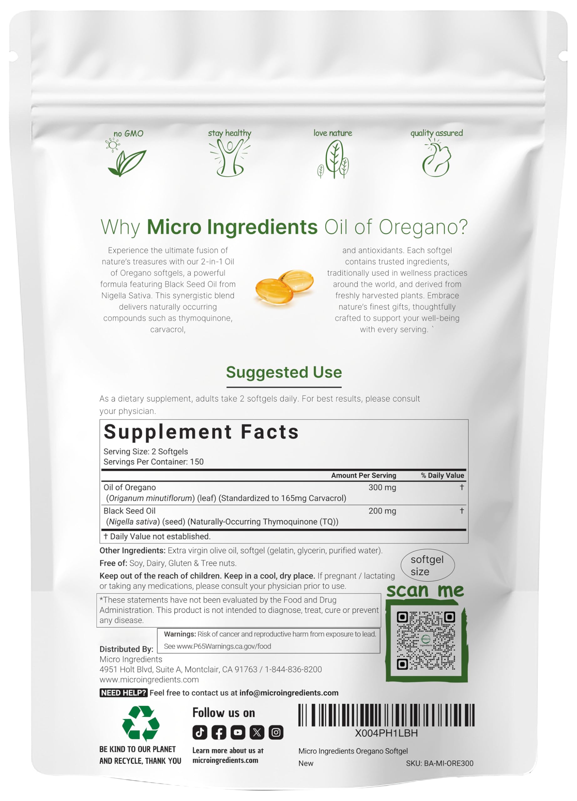 · Premium non-GMO oregano oil supplements. Made without soy, dairy, gluten, preservatives, flavors, and tree nuts. Ingredients must pass a 3rd party lab test to ensure our product is safe, pure, and potent.