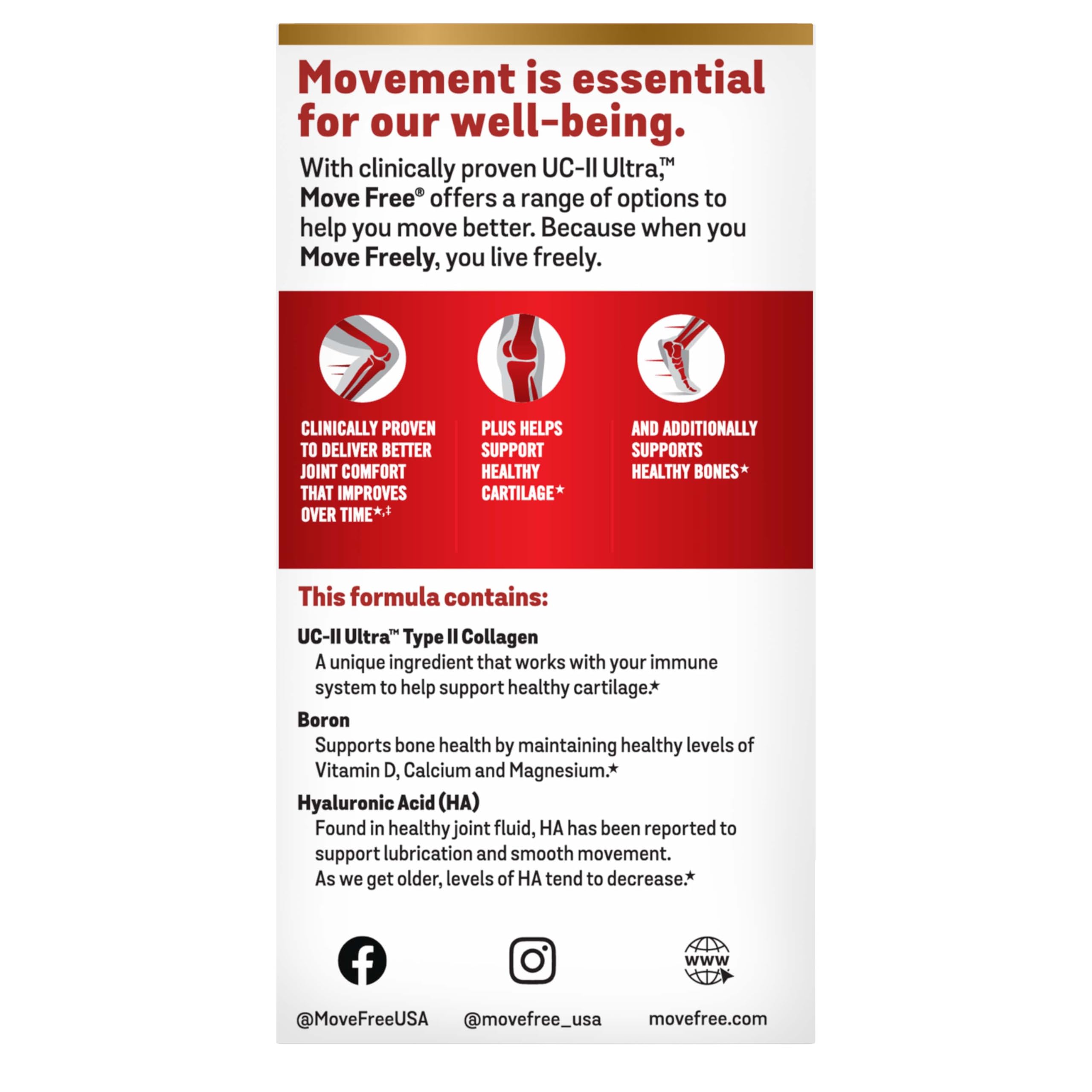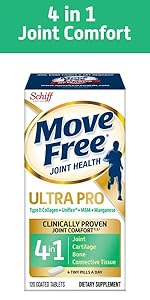 JOINT SUPPORT: Move Free Ultra features type 2 collagen to supports joint and cartilage health to deliver better flexibility, mobility, and joint comfort.* TRIPLE ACTION FORMULA: Provides joint, cartilage, and bone support in a single tiny tablet, making it an ideal supplement for those seeking help with daily movement.* CLINICALLY TESTED TYPE II COLLAGEN: Contains UC-II Ultra(R) collagen that works with your immune system to help support healthy cartilage and joint for better jonit comfort as you age.* BONE HEALTH SUPPORT: Boron helps maintain healthy levels of Vitamin D, Calcium and Magnesium, which support bone health. Plus healthy bones are key for healthy joints.* ONLY 1 TINY TABLET: These joint support supplement tablets are made with your convenience in mind. Only take 1 tiny easy-to-swallow tablet a day for the best results. FOR MEN AND WOMEN: These collagen pills for woman and men are great joint supplements for women and men who are active in sports or facing daily normal joint wear and tear.* DEVELOPED BY SCIENTISTS: The MOVE FREE product family with clinically tested ingredients, offers a range of solutions to help you move better. Because when you MOVE FREE-ly, you live freely. * These statements have not been evaluated by the Food and Drug Administration. This product is not intended to diagnose, treat, cure or prevent any disease.