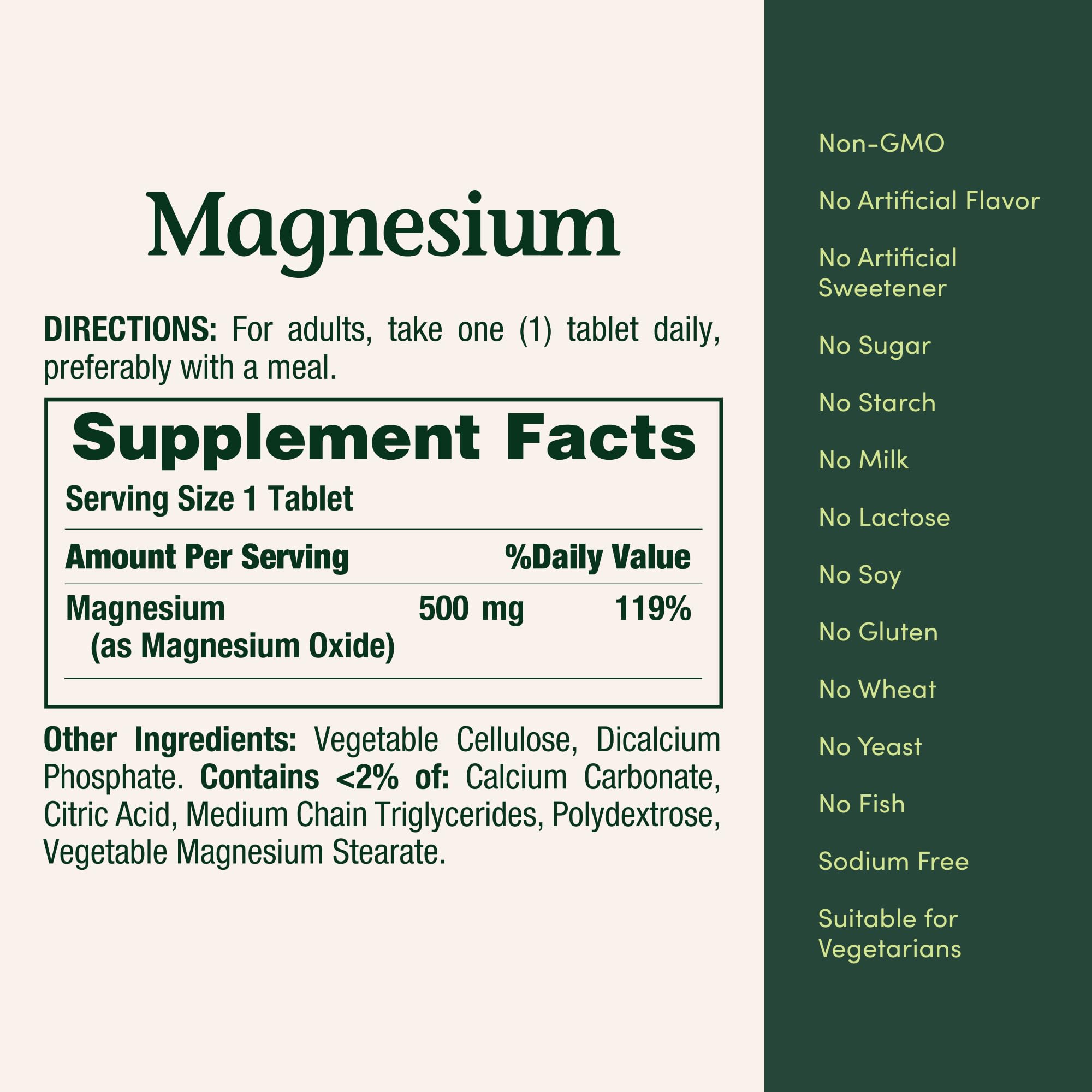 · HIGH POTENCY FORMULA: Each Nature’s Bounty Magnesium 500mg tablet provides 119% of the recommended daily intake