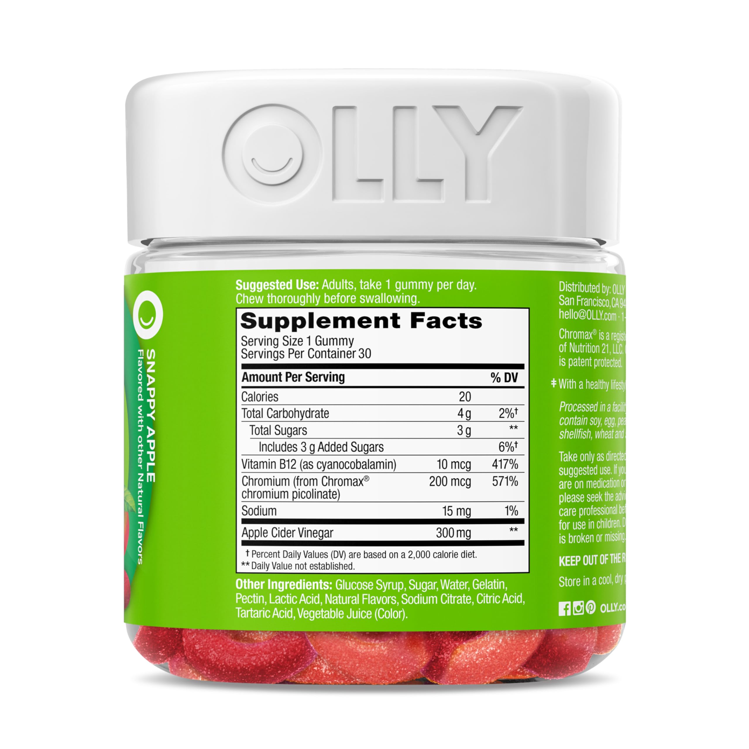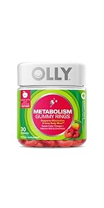 OLLY Metabolsim Gummy rings are formulated with goodness to promote cellular energy and a happy, healthy metabolism.* They’re expertly blended with Chromium Picolinate, a clinically-studied amount that supports lean body mass‡ and helps boost metabolism, Vitamin B12 for cellular energy production and Apple Cider Vinegar with the Mother. The gummy rings come in a super delicious Snappy Apple flavor with other natural flavors, so you get Apple Cider Vinegar without having to drink it. No synthetic flavors or colors, and they’re gluten-free. Adults, take 1 gummy per day. Chew thoroughly before swallowing.* At OLLY, good health is at the center of everything we do. We create delightful vitamins and supplements with real-deal benefits that help you live Happy Inside Out. ‡With a healthy lifestyle, including exercise. *These statements have not been evaluated by the Food and Drug Administration. This product is not intended to diagnose, treat, cure or prevent any disease.