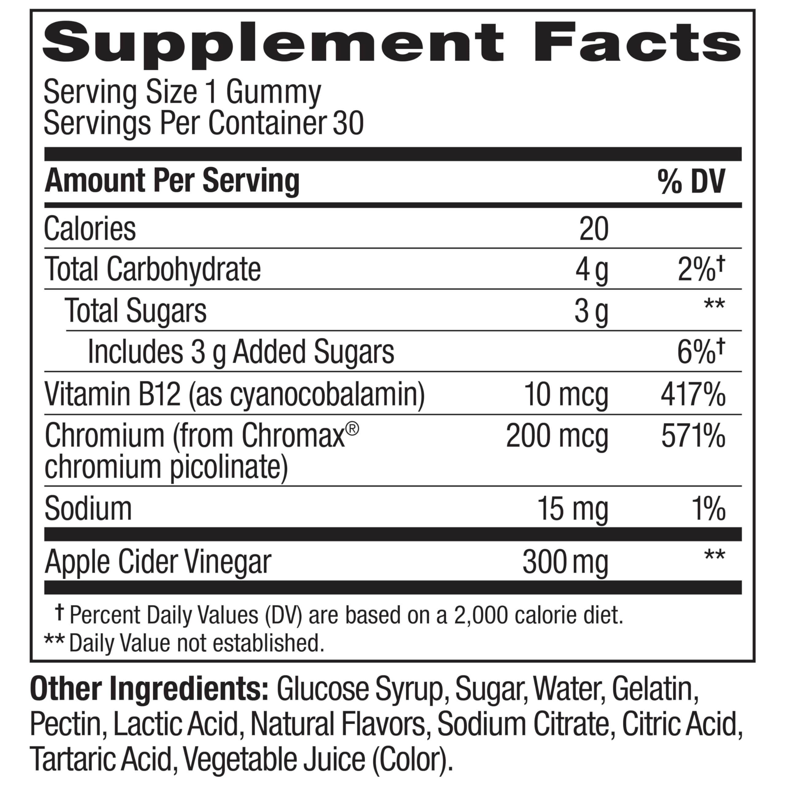 A totally tasty gummy ring made with Vitamin B12 and Chromium Picolinate to support lean body mass‡ and help boost metabolism* and Apple Cider Vinegar with the “”mother”” used at home for centuries. ‡With a healthy lifestyle, including exercise.