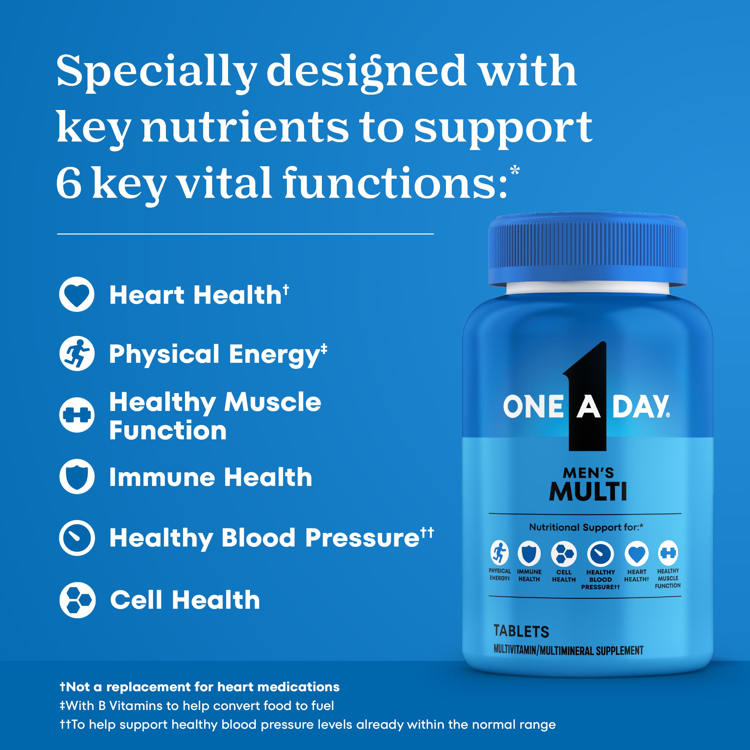“Support your active lifestyle with One A Day mens multivitamin. These mens vitamins are specially designed with key nutrients to support 6 key vital functions:* physical energy with B Vitamins (1), immune health with Vitamins A, C, D, E, Selenium and Zinc, healthy muscle function with Vitamin D and Magnesium, heart health (2) with Folic Acid and Vitamins B6 & B12, healthy blood pressure (3) with Vitamin D and Magnesium, and cell health with Vitamins A, C, E, and Zinc. Rich in 19 key nutrients, our men daily multivitamin are specially designed to help fill common nutrient gaps. One A Day multivitamin for men with 80 years of expertise designing science backed formulas​​ from the #1 multivitamin brand specially designed for men. (1) With B Vitamins to help convert food to fuel​ (2) Not a replacement for heart medications *This statement has not been evaluated by the Food and Drug Administration. This product is not intended to diagnose, treat, cure, or prevent any disease. (3) To help support blood pressure levels already within the normal range “